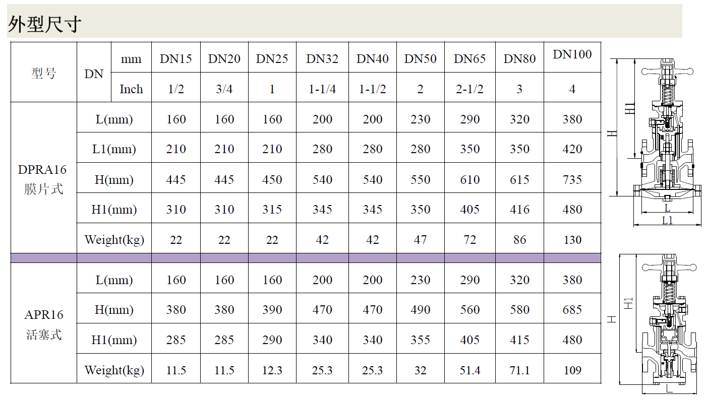 8、DN15~50口徑,建議選用膜片式減壓閥DPRA16;DN65及以上口徑,建議選用活塞式減壓閥PRA16。