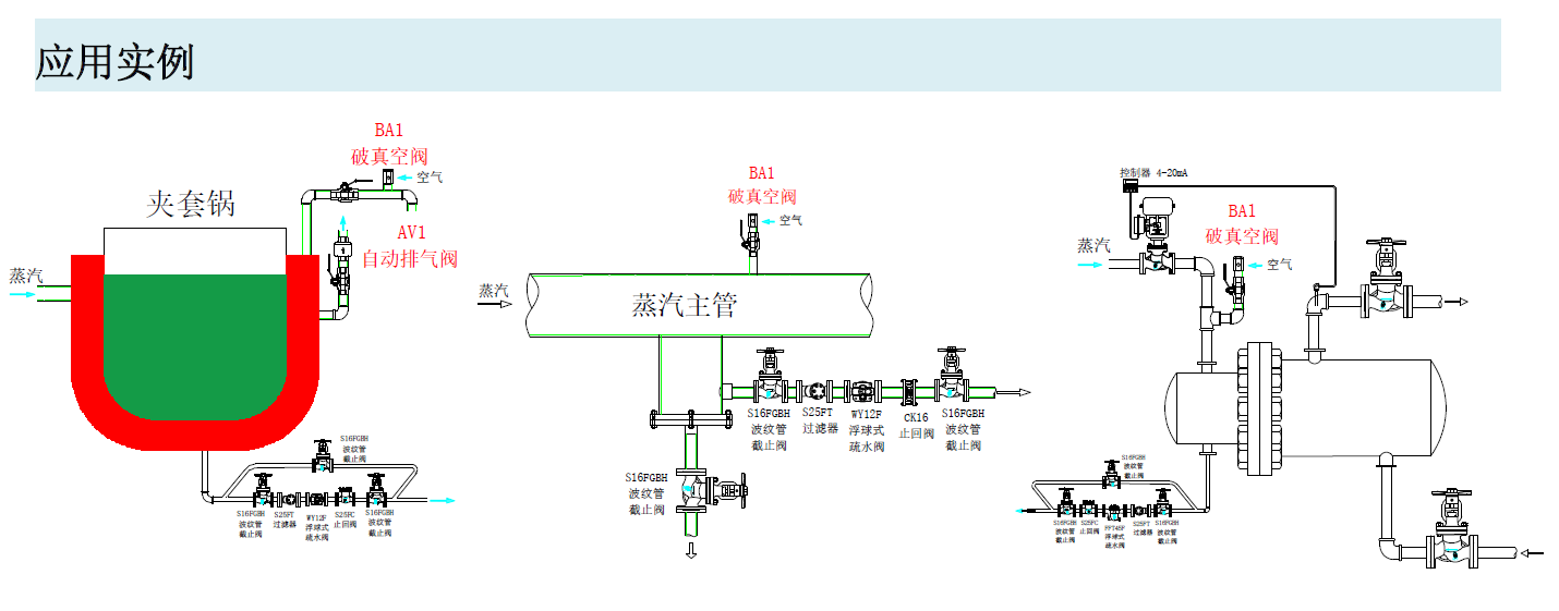 主要用于蒸汽和以液體介質為主的系統。如:蒸汽主管、汽-水換熱器、空氣盤管、夾套鍋、存儲罐、滅菌室、鍋爐給水罐、噴霧系統、液體工藝管線以及冷卻水系統。