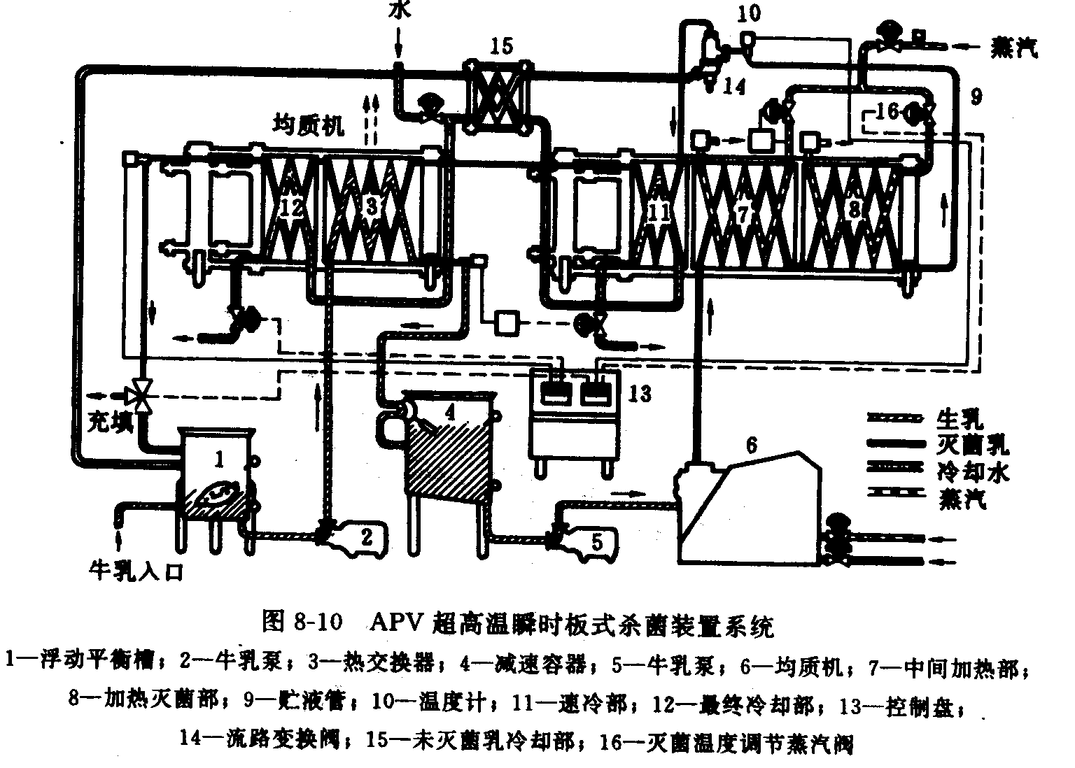 5) 由儀表自動控制的分流閥,蔣已達(dá)到殺菌溫度的產(chǎn)品送到第一冷卻段11,將未達(dá)到殺菌溫度的牛奶送至水冷卻器15,將其降溫后回流到平衡槽1中;