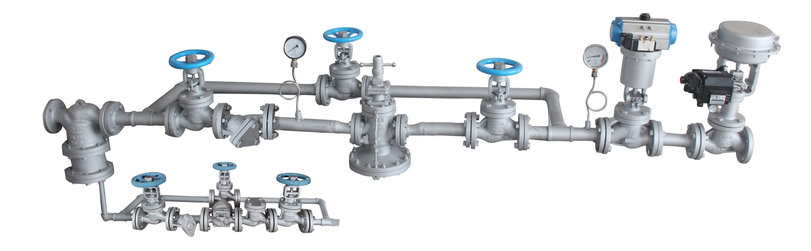 首先,蒸汽進(jìn)來時要先用減壓閥把壓力降下來且穩(wěn)定住,然后蒸汽的氣動控制閥(比例調(diào)節(jié)閥)需要3臺;冷卻水的氣動控制閥(比例調(diào)節(jié)閥)也需要3臺;每一段加熱器下面均需要單獨(dú)疏水,疏水閥必須連續(xù)及時排放冷凝水,確保沒有積水。疏水閥建議選用way’s浮球式疏水閥。