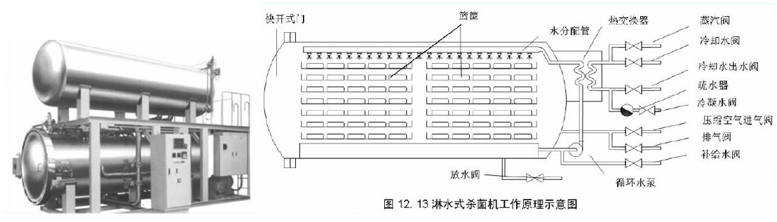 2、對于玻璃瓶或軟包裝產品,則不宜使用蒸汽直接進行殺菌,應該在罐內注滿水,先用蒸汽加熱水,讓產品在熱水中進行殺菌。如下面的浸水式和淋水式殺菌機