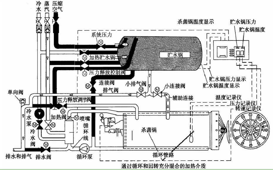 3、對于袋裝食品、大聽罐頭、螺旋蓋玻璃罐、鋁制罐及易開罐等產品,應該選用回轉式殺菌機,因為這種殺菌設備的貯水鍋內壓力是自動控制的,壓力非常穩定,可防止產品包裝容器變形或破損;另外還可以縮短殺菌周期,提高產能,且節能。尤其是肉類產品、高粘度、半流體和熱敏性食品,因殺菌籃的回轉,避免了食品與罐壁粘結的問題。下圖為淋水回轉式殺菌機流程圖:(一般采用6-8barg的蒸汽直接噴射加熱,殺菌溫度150℃)