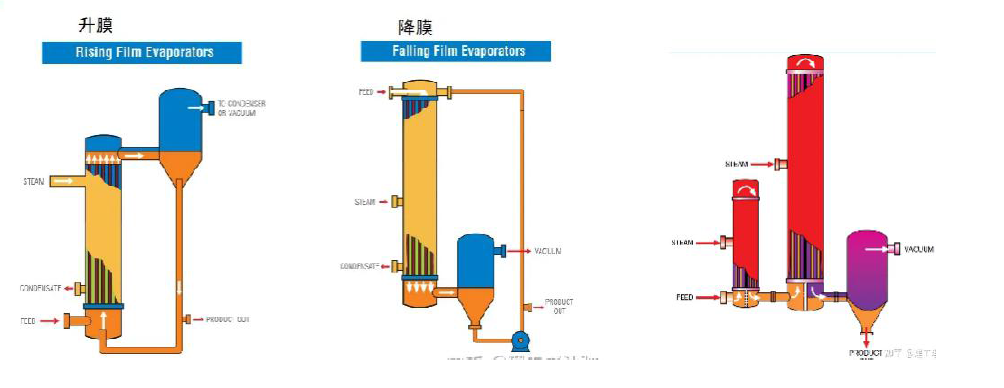 經(jīng)常有聽(tīng)到升膜、降膜蒸發(fā)濃縮器,它們的主要區(qū)別在于,物料進(jìn)入加熱管并在管壁上形成薄膜,這個(gè)過(guò)程上升還是下降的問(wèn)題。有些系統(tǒng)里面,其一個(gè)加熱器里就兼有升降膜。