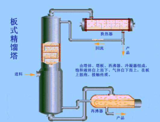 精餾過程的主要設備有:精餾塔、再沸器、冷凝器、回流罐和輸送設備等。精餾塔以進料板為界,上部為精餾段,下部為提餾段。一定溫度和壓力的混合料液進入精餾塔后,輕組分在精餾段向上逐漸濃縮,離開塔頂后全部冷凝進入回流罐,一部分作為塔頂產品(也叫餾出液),另一部分被送入塔內作為回流液。回流液的目的是補充塔板上的輕組分,使塔板上的液體組成保持穩定,保證精餾操作連續穩定地進行。而重組分在提餾段中向下濃縮后,一部分作為塔釜產品(也叫殘液),一部分則經再沸器加熱后送回塔中,為精餾操作提供定量連續上升的蒸氣氣流。