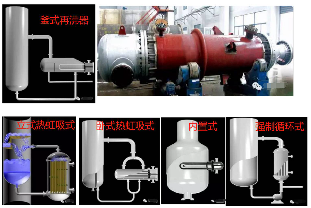 再沸器能使液體再一次汽化,是一個能夠交換熱量,同時有汽化空間的一種特殊換熱器。再沸器有好幾種類型,包括釜式再沸器、立式和臥式熱虹吸再沸器、內置式再沸器、強制循環式再沸器和降膜式再沸器五大類,這里以比較常用的釜式再沸器為例來說明。