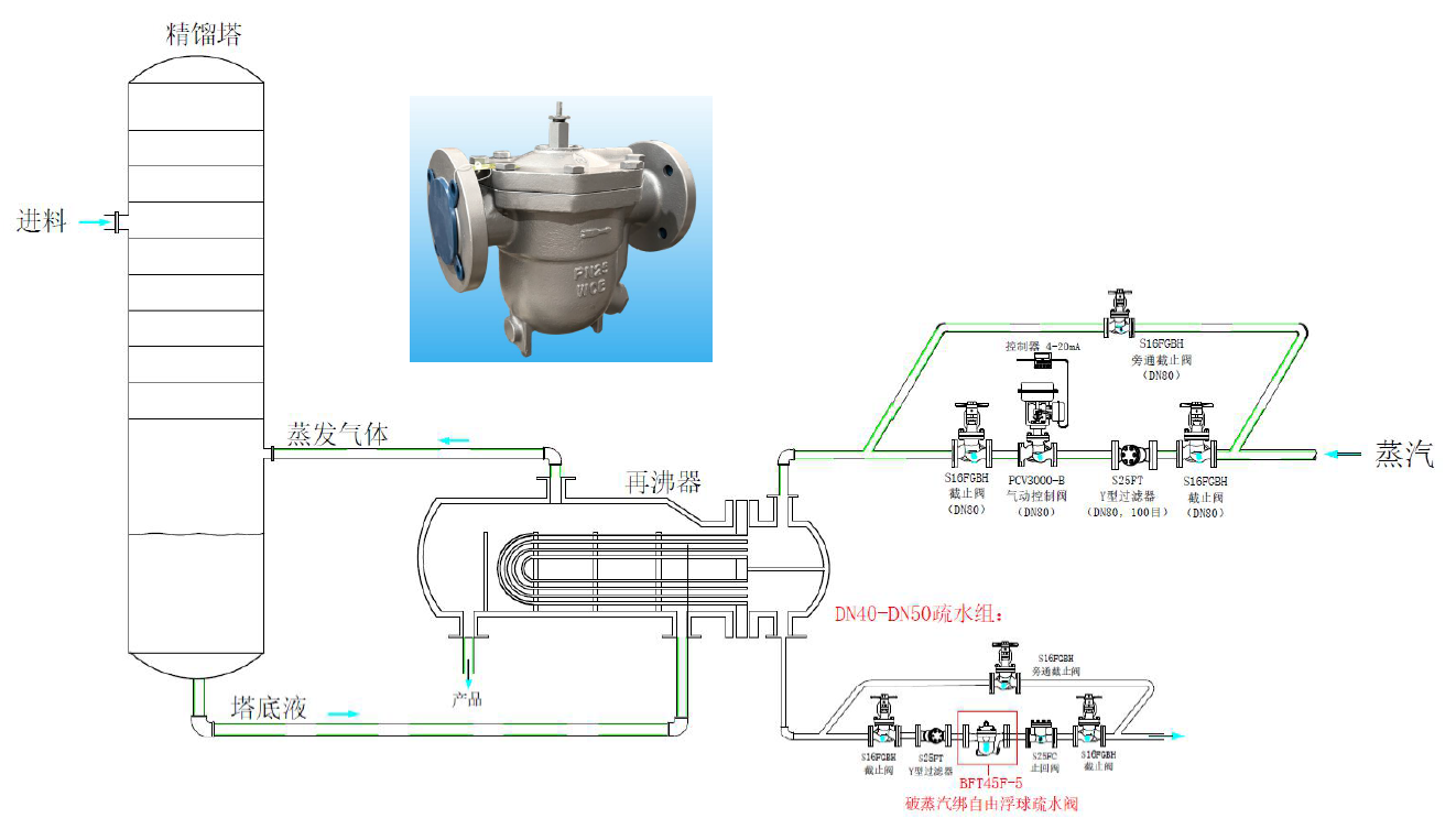 精餾塔其實很嬌氣,當有不該進入的物料如不凝氣體被加入,或者較重組分進入都會讓塔不舒服。所以嚴格控制精餾塔的菜單是精餾塔操作平穩的至關重要的條件,輕重組分物料不能隨便改,如果有不凝氣體進入系統,必須立即排掉它,因此操作時需要手動排氣!也非常有必要加裝自動排氣閥,可以與疏水閥并聯安裝;另外,這個工況和容易產生“蒸汽綁”,因此疏水閥需要選用自帶熱靜力排空膜盒和破除“蒸汽綁”裝置的自由浮球疏水閥,比如廣州維遠way’s破汽綁自由浮球疏水閥,型號BFT45F,DN40~50;BFT18F,DN32~40。