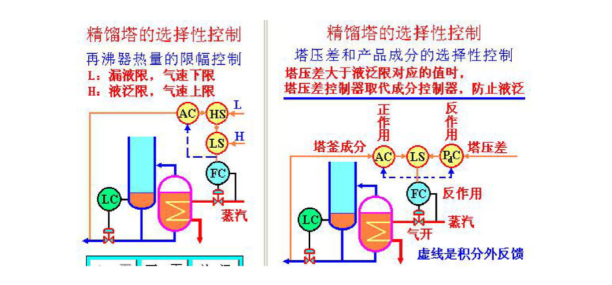 (4)控制閥的正反作用選擇:一般來說,加熱蒸汽和進料管道選用氣開式的(失效關),回流或循環水管道選用氣關式的(失效開)。