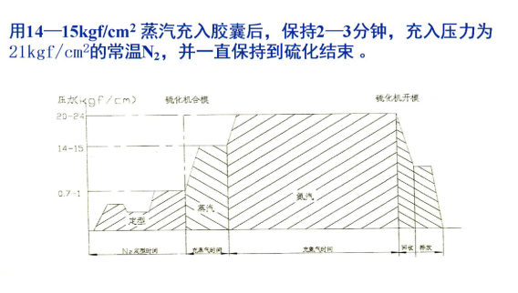 B、高溫蒸汽和過熱水硫化:膠囊內先充入1.5MPa的高溫蒸汽,一定時間后再充入壓力較高的過熱水,一般用于轎車子午線輪胎;(能耗很大,正逐步被氮氣硫化替代)