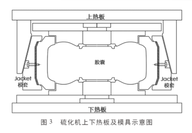 生胎入模后,先用低壓蒸汽(0.03MPa~0.3MPa)充入定型并合模,接著以高壓蒸汽(1.4MPa~1.7 MPa)吹入膠囊,吹入時間一般持續2min~8min,待蒸汽充入量可確保硫化周期結束前膠囊內溫度不低于150℃即可;然后再切換通入氮氣(2.0-2.8MPa),利用充氮硫化的“保壓保溫”工藝硫化至結束,期間要經過幾次排凝;硫化結束后將混合氣體排出、開模、卸胎。