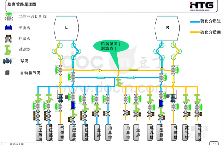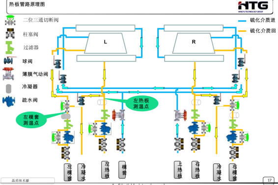 熱硫化的設備主要有硫化罐和平板硫化機等,子午胎硫化主要采用雙模定型硫化機,也稱熱板硫化機,其中熱工管路是硫化機的重要組成部分。這些管路控制硫化介質進入膠囊、蒸汽室(熱板和模套),實現抽真空控制、定型控制、膠囊內壓控制以及蒸汽室溫度控制的動作,管路中的執行元件主要有氣動切斷閥、氣動控制閥(調節閥)、平衡閥、疏水閥、止回閥、截止閥等閥門。