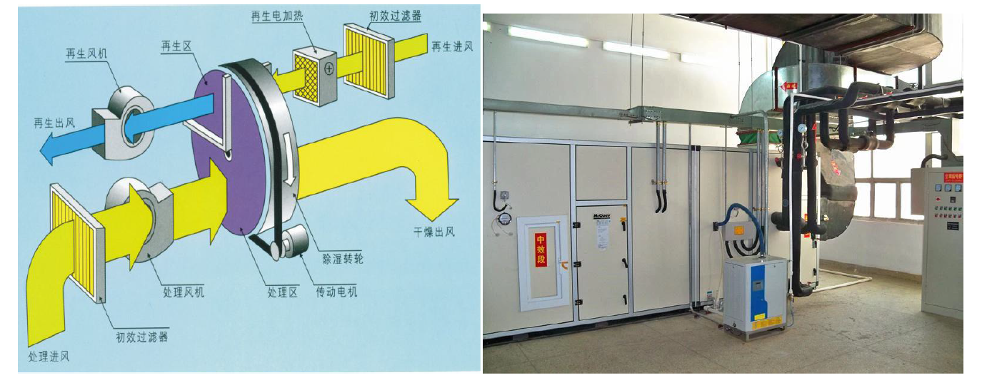 1、預(yù)冷和除濕:在空氣進(jìn)入壓縮機(jī)之前,可以通過(guò)預(yù)冷裝置降低空氣的溫度和濕度,減少進(jìn)入壓縮機(jī)時(shí)的水蒸氣含量,對(duì)濕度要求很嚴(yán)格的用戶(比如制藥、乳品、電子、鋰電等行業(yè)),新風(fēng)可以采用轉(zhuǎn)輪除濕。同時(shí),在壓縮機(jī)出口處設(shè)置除濕裝置(如冷干機(jī)、吸附式干燥機(jī)等),進(jìn)一步去除壓縮空氣中的水分。