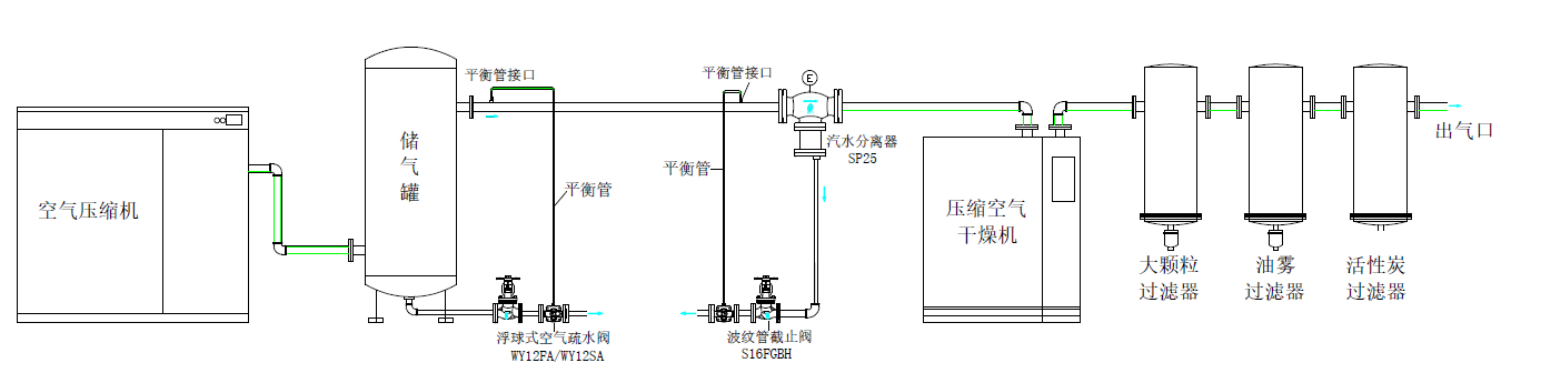 經(jīng)過(guò)冷干機(jī)加熱再次除水、凈化進(jìn)入潔凈儲(chǔ)氣罐,在后續(xù)的輸送管道上,若管路太長(zhǎng),建議也要安裝汽水分離器,然后在每一個(gè)小型分支儲(chǔ)氣罐底部都要安裝空氣專用疏水閥。
