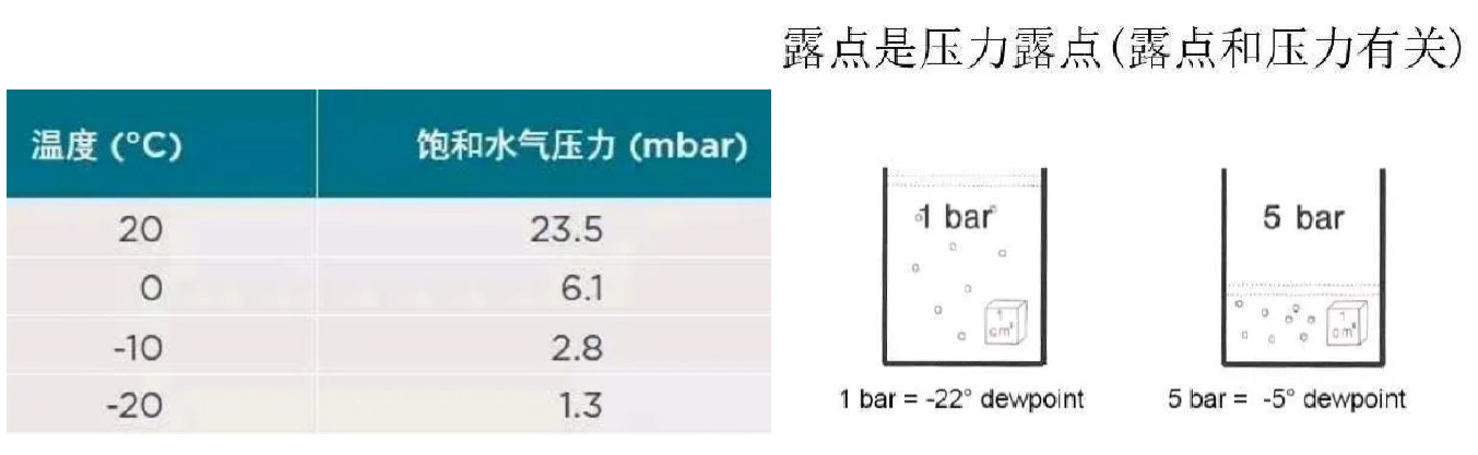 相對(duì)濕度是指在給定環(huán)境下,空氣中水蒸氣分壓與同溫度下水的飽和蒸汽壓之比,當(dāng)相對(duì)濕度達(dá)到100%時(shí),空氣中的水蒸氣就會(huì)開(kāi)始凝結(jié)成液態(tài)水。這是因?yàn)殡S著溫度的降低,空氣能夠容納的水蒸氣量也減少,多余的水蒸氣就會(huì)以液態(tài)水的形式析出,也就是冷凝水。相對(duì)濕度與氣溫成負(fù)關(guān)系,關(guān)于這個(gè)問(wèn)題,我們后面還需要引出“露點(diǎn)”和“壓力露點(diǎn)”的概念。