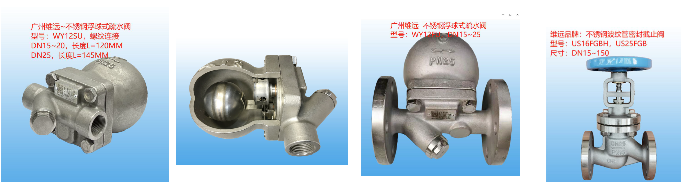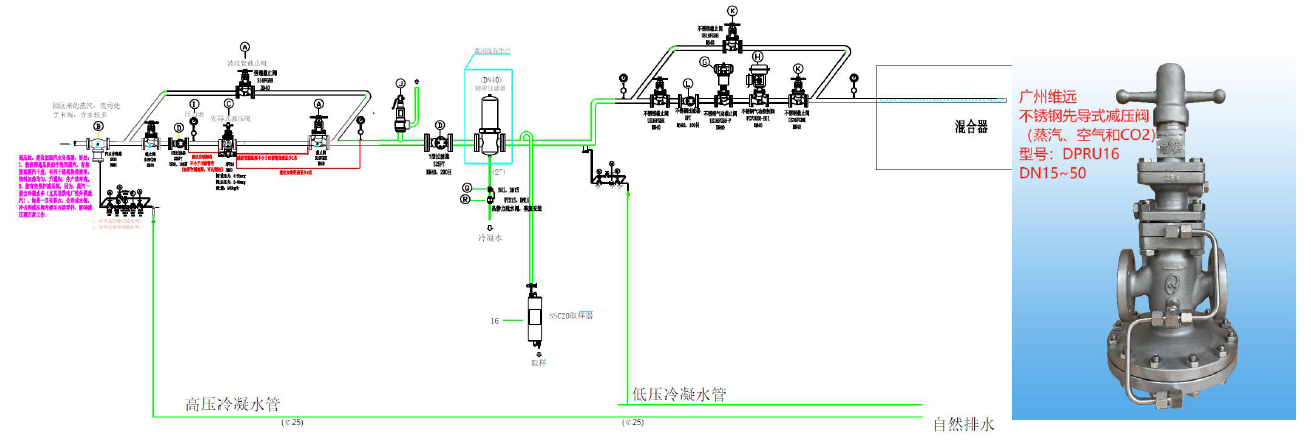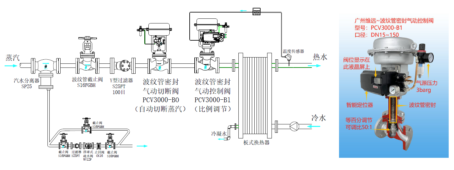 這里主要考慮工業蒸汽來汽段要做減壓站,確保蒸汽壓力穩定;過濾蒸汽段,主要是需要選用不銹鋼材質的氣動切斷閥或氣動波紋管截止閥,比如Way’s品牌的切斷閥PCV3000-BOU;也可以用不銹鋼氣動球閥或角座閥(不建議);有些公司會同時配有氣動調節閥。