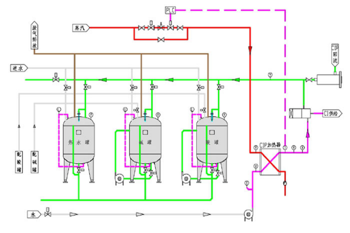 CIP清洗系統主要由酸罐、堿罐、水罐、濃酸濃堿桶、加熱系統、隔膜泵、高低液位、在線酸堿濃度檢測儀及PLC觸摸屏控制系統組成。其中酸罐、堿罐、水罐為保溫罐,此外酸堿罐還設有攪拌系統。我們今天主要來分析酸堿儲液罐和熱水罐蒸汽加熱系統的疏水閥組和氣動控制閥門系統。