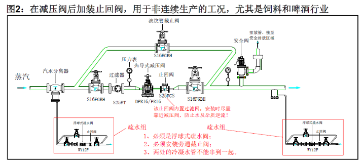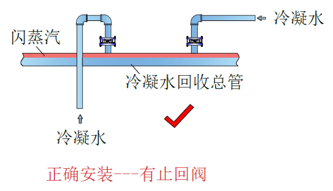 1)當高壓的冷凝水通過疏水閥排放至一個較低壓力的區域,會產生一定量的閃蒸汽,如果這些閃蒸汽流入充滿低溫冷凝水的回收管線,閃蒸汽就會把它的潛熱傳遞給冷凝水從而快速冷凝,產生水錘。在這種工況下,安裝止回閥就起不了作用,反正低壓的冷凝水也不會回流,因此可以不裝。