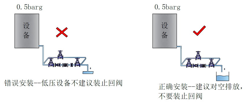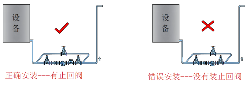 4)如果疏水閥后的冷凝水管道有爬升,一旦設備停機,或設備前氣動閥門切斷蒸汽,這時設備內會出現真空,導致疏水閥后背壓超過前端壓力從而發生倒流,在這種情況下,疏水閥后也必須安裝止回閥,能有效防止水錘。