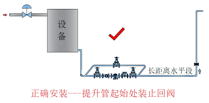 5)如果加熱設備前有調節閥或切斷閥,疏水閥后的冷凝水管道又有爬升,且在爬升管前還有一段較長的水平管,那么爬升管倒流的冷凝水有可能和新排出的冷凝水相碰撞,從而導致水錘;在這種工況下,需要在提升管的起始位置安裝一個止回閥,對防止水錘的發生有極大的幫助。