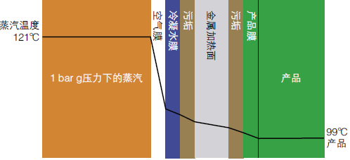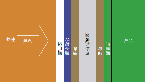 在傳熱過程中金屬墻不是唯一的熱阻。在蒸汽側可能有一層空氣膜、冷凝水膜和污垢層。在產品側可能有粘在換熱面上的產品層或污垢層以及遲滯不流動的產品層。