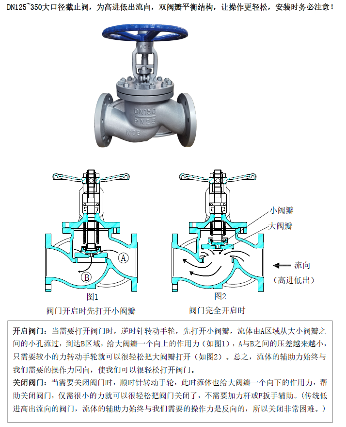 1、在日常使用大口徑截止閥的用戶中,大家常常反映一個問題,即大口徑截止閥用于壓差比較大的介質上,如蒸汽、高壓水等帶壓工作時,往往很難關閉,無論怎樣用力關閉,總是發現會有泄漏現象,很難關緊,造成這一個問題的原因是由閥門的結構設計與人的極限水平輸出力矩不足而造成的。