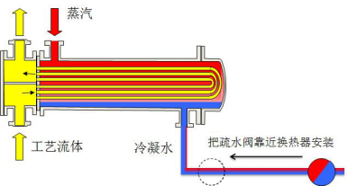 4.1疏水閥一般要安裝在換熱設備的最低點,并盡可能的接近換熱設備,要求是1米以內的距離,如果距離太長,容易產生“蒸汽綁”問題。