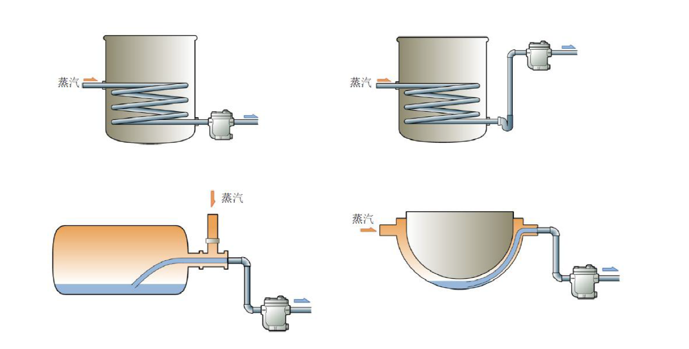 7、如果設備的最低處沒有位置安裝疏水閥,應在出水口最低位置加個反水彎(冷凝水提升接頭),把冷凝水位提升后再裝疏水閥,以免產生蒸汽綁。