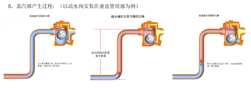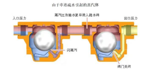 A、冷凝水在第一個疏水閥出口因壓力下降而閃蒸,閃蒸汽進入第二個疏水閥內,出現蒸汽綁鎖閉現象,而導致第二個疏水閥排水不順暢,造成堵水。