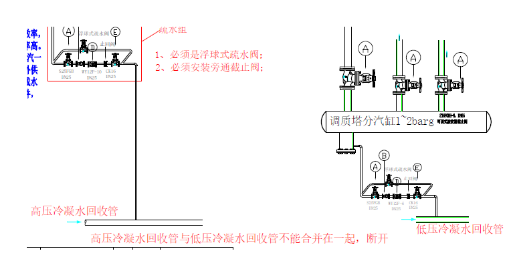 A、高壓和低壓的冷凝水都回收到一起,高壓冷凝水回流阻止低壓冷凝水排放,導致堵水;