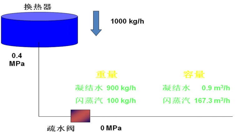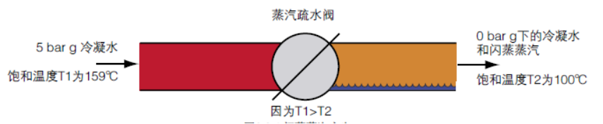 換句話說,當熱的冷凝水排放到低壓的環境中,它的熱焓(總熱量)保持不變,但飽和溫度降低(水的氣態和液態共存的溫度)。為了保持總熱量不變,部分的水吸收了熱量蒸發成蒸汽。