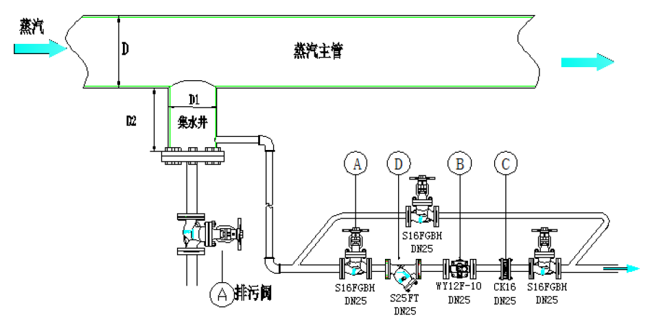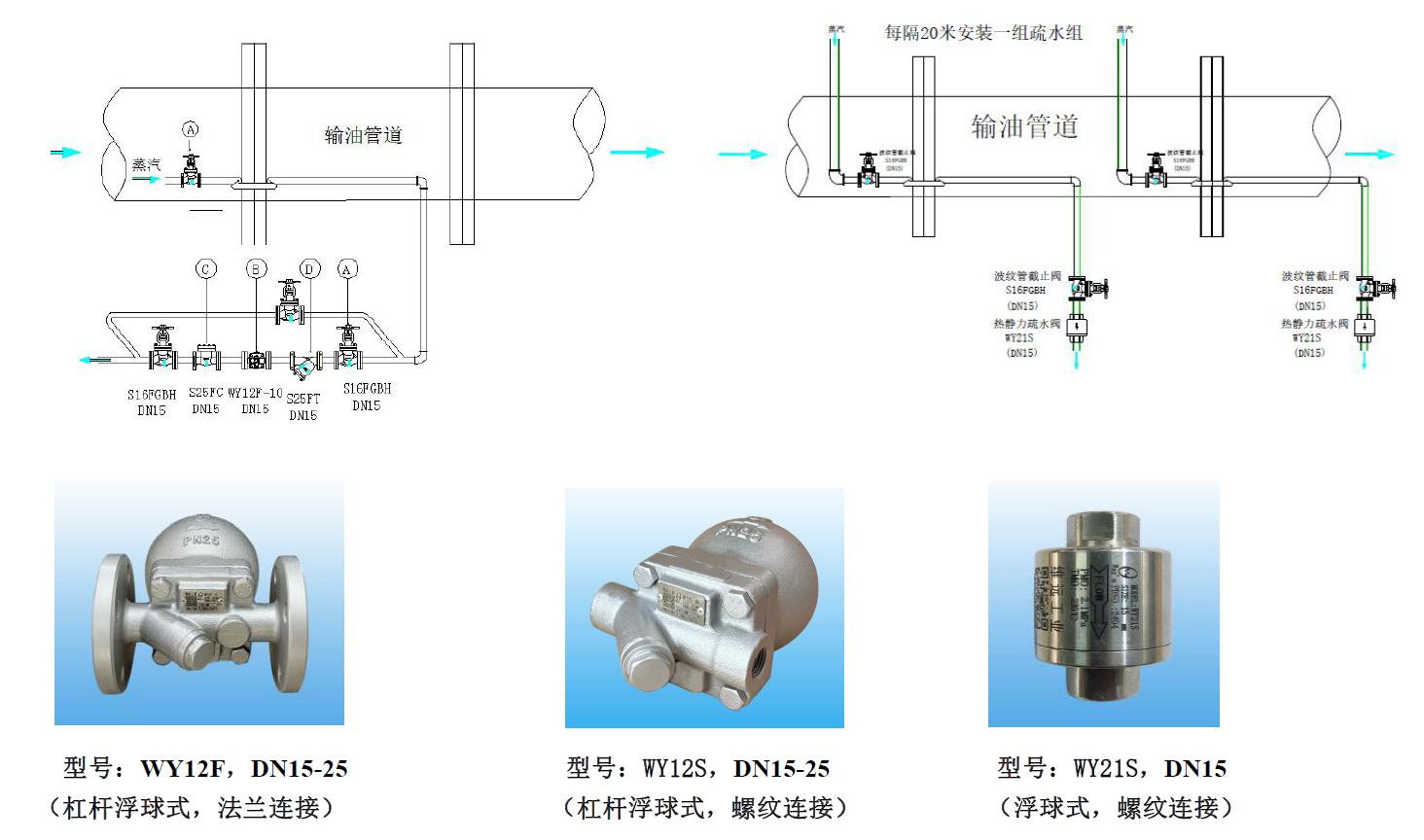 A、蒸汽主管中通常包含有凝結在管壁上的水膜、懸浮在蒸汽中水滴和空氣。為使設備效率最高,必須排除空氣和水。因為主管冷凝水量很少,因此選用way’s杠桿浮球疏水閥WY12F(法蘭)或WY12S(螺紋)系列合適。