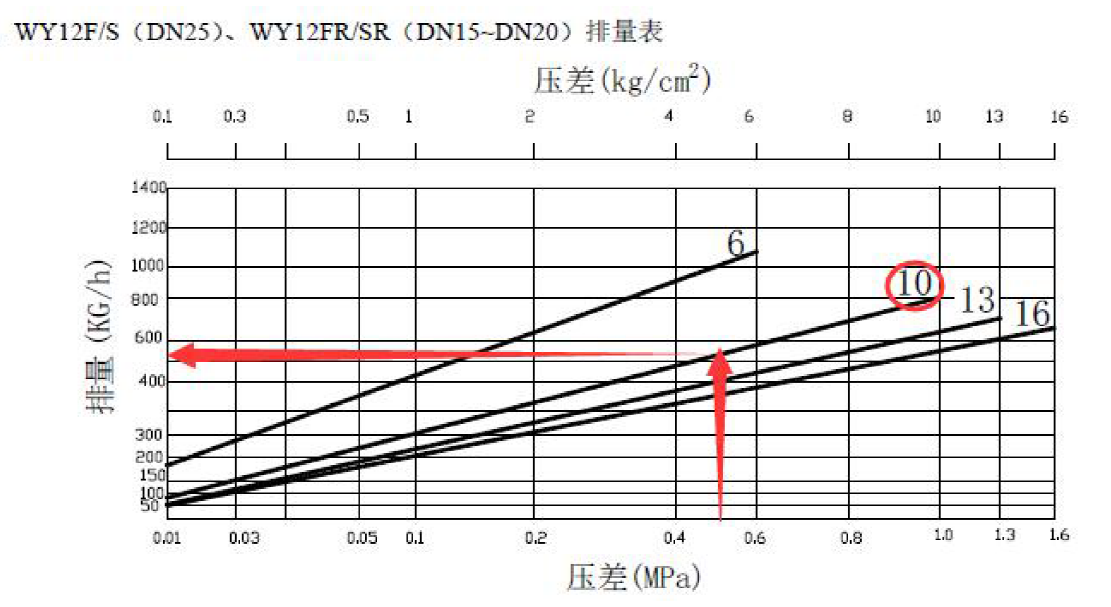 已知蒸汽壓力為6Barg,背壓0.5~1barg,最大壓差5.5barg,工作流量203kg/h。因此,我們選擇疏水閥型號時,首先考慮這個型號在閥嘴最大壓差為5Barg(即0.5MPa)時,排水能力必須大于203kg/h。對照疏水閥排量表,選擇閥嘴壓差編號為“-10”既大于實際壓差5.5Barg,又不會偏差過多。再看向縱、橫坐標與-10曲線的交匯點,得知疏水閥的最大排量為500kg/h,大于工況要求的203kg/h,并且有足夠的余量,應對剛開機水量多的及時排放,因此選型WY12F-10,DN25為最佳選型。