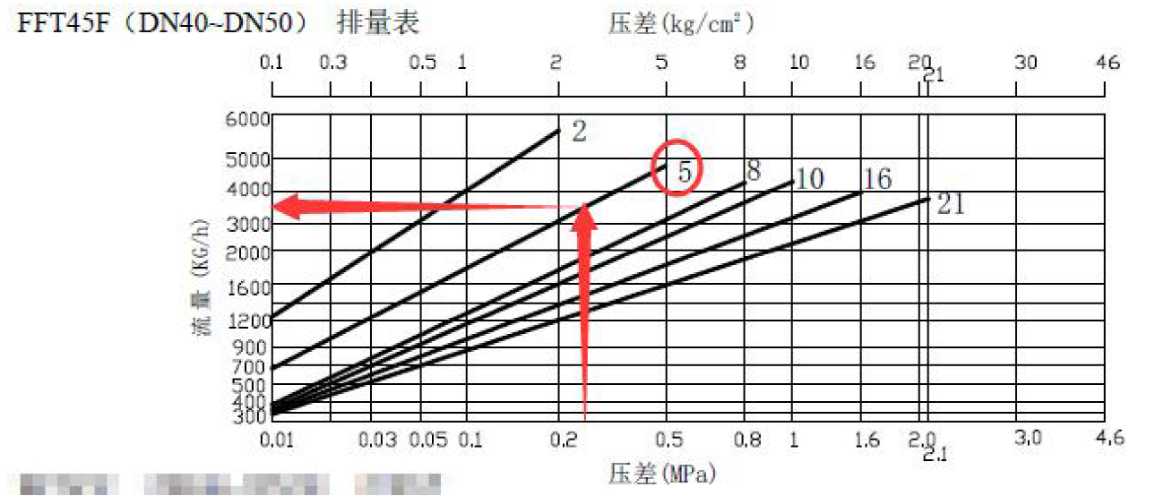 原理方法同上,需滿足最大壓差3.5barg時,疏水閥排水量大于2233kg/h,對照疏水閥排量表,選擇閥嘴壓差編號為“-5”既大于實際壓差3.5Barg,又不會偏差過多,而疏水閥的最大排量為3500kg/h,大于工況要求的2233kg/h,并且有足夠的余量,應對剛開機水量多的及時排放,因此選型FFT45F-5,DN50的自由浮球疏水閥為最佳選型。
