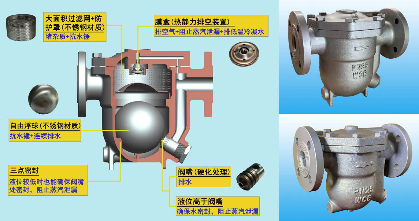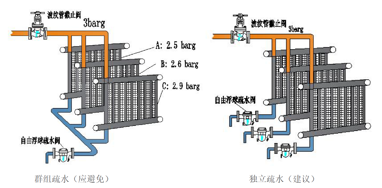 但是,如果是細長型的列管換熱器,往往會產生“蒸汽綁”現象,這時需要選用專業帶有破除“蒸汽綁”裝置的自由浮球疏水閥,如WY42FB,WY42SB、BFT18F、BFT45F。