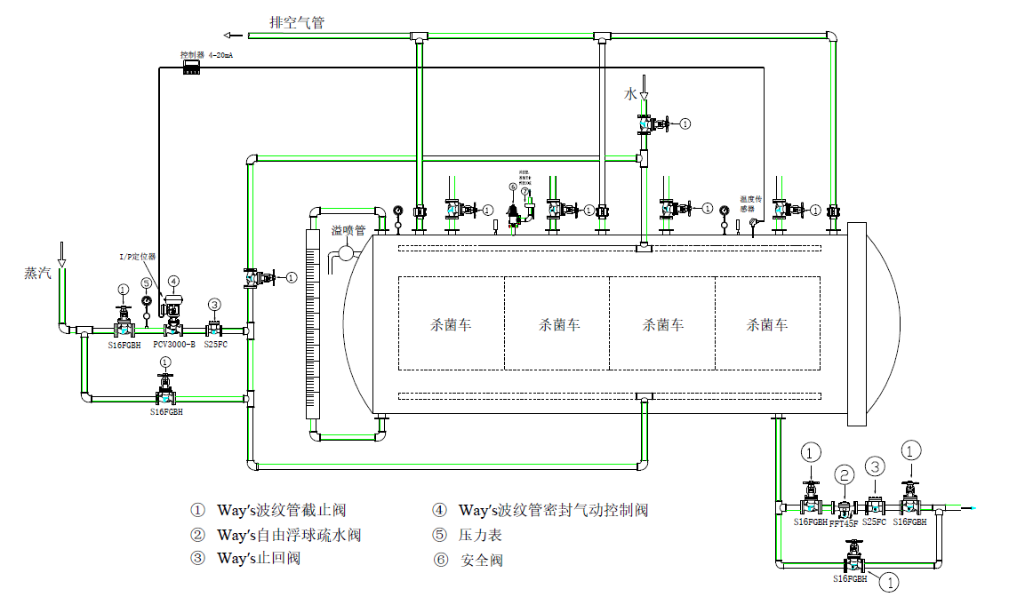 疏水閥的選型:殺菌鍋蒸汽耗量根據流體儲存式加熱器的蒸汽耗量計算公式,再結合現場工況壓力、疏水閥排量表、連接方式等參數來綜合選型!Way′s品牌量浮球式疏水閥RFT18F、FFT45F型號均適用于該設備,可以連續及時排放冷凝水,確保沒有積水,不會產生水錘震動等問題,確保高效節能。