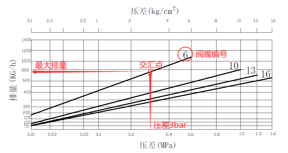 已知壓差為3Barg,設備用汽量400KG/H*1.35安全余量=540KG/H。因此,我們選擇的疏水閥型號,在壓差為3Barg時,最大排水能力必須大于540KG/H。對照疏水閥排量表(紅色字體示例圖),選擇閥嘴壓差編號為“-6”既大于實際壓差3Barg,又不會偏差過多。再看向縱、橫坐標與-6直線的交匯點,得知排水能力大于工況要求的540KG/H,因此選型WY12F-6為最佳選型。