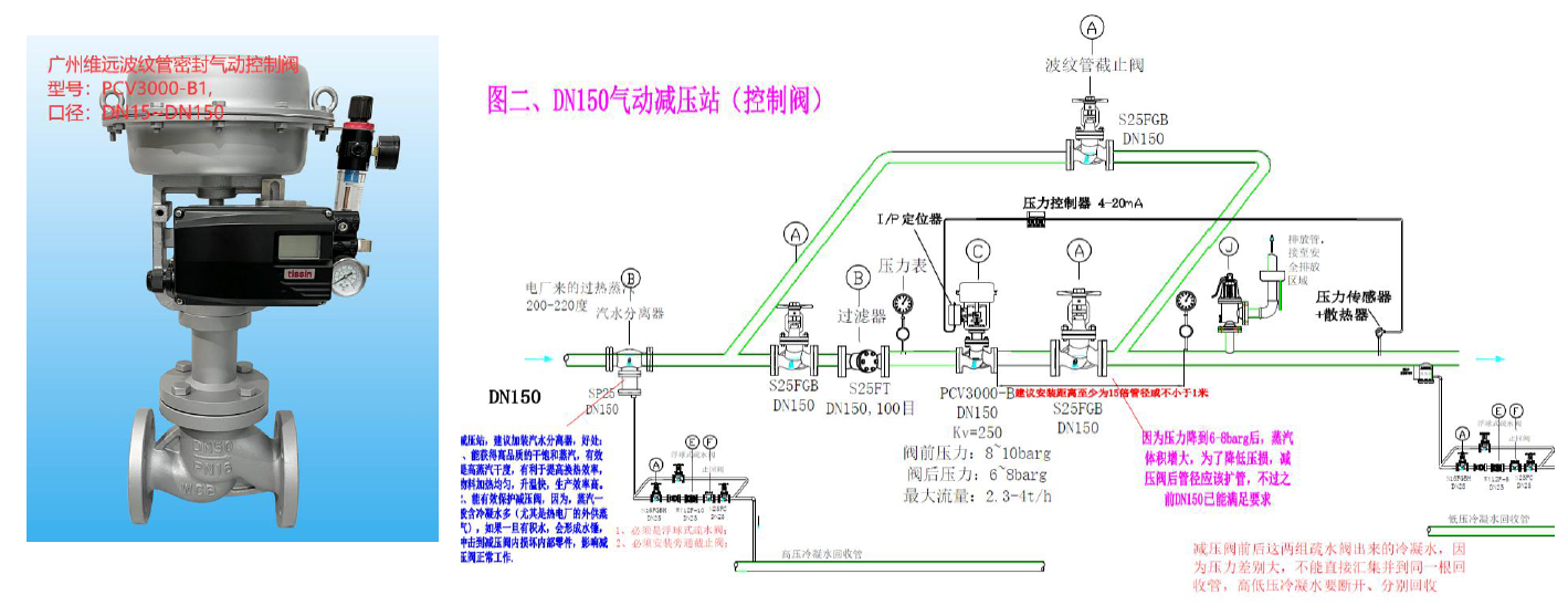 與壓力變送器和壓力控制器配套使用,通過反饋信號來實現(xiàn)蒸汽壓力的等百分比調(diào)節(jié)。現(xiàn)在越來越多的用戶開始選用氣動控制閥來替代傳統(tǒng)的減壓閥,尤其是DN100及以上大口徑,主要是基于兩個因素:一是整套大口徑減壓站的成本很高,接近甚至高于一套氣動控制閥系統(tǒng)的成本(包括管道和安裝成本),二是氣動控制閥對冷凝水沒有減壓閥那樣敏感。