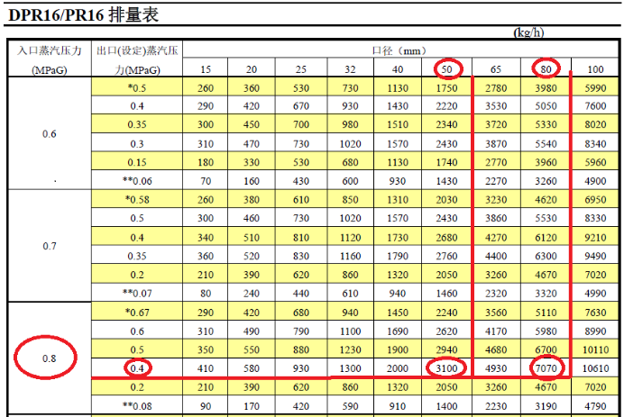 通過以上減壓閥選型流量表得知,在減壓范圍是8減至4Barg時,DN80流通能力為7070kg/h,而DN50流通能力為3100kg/h。