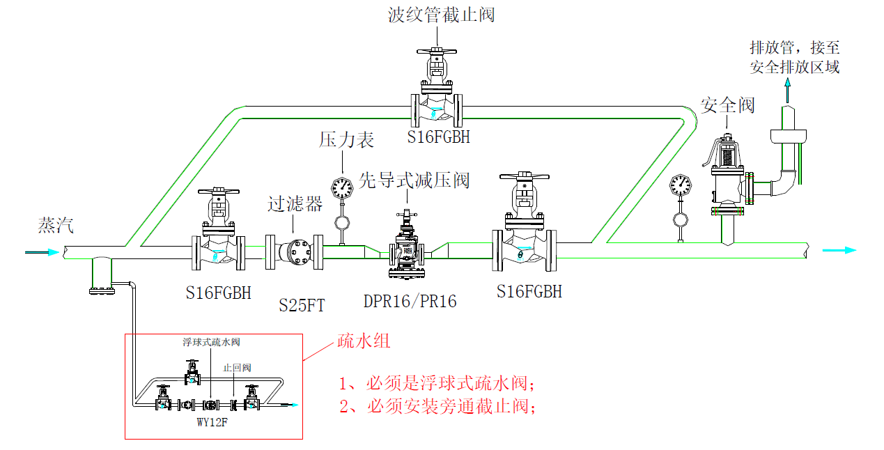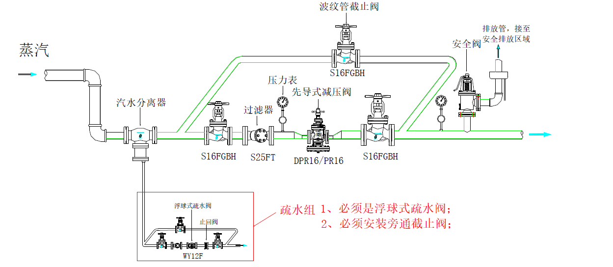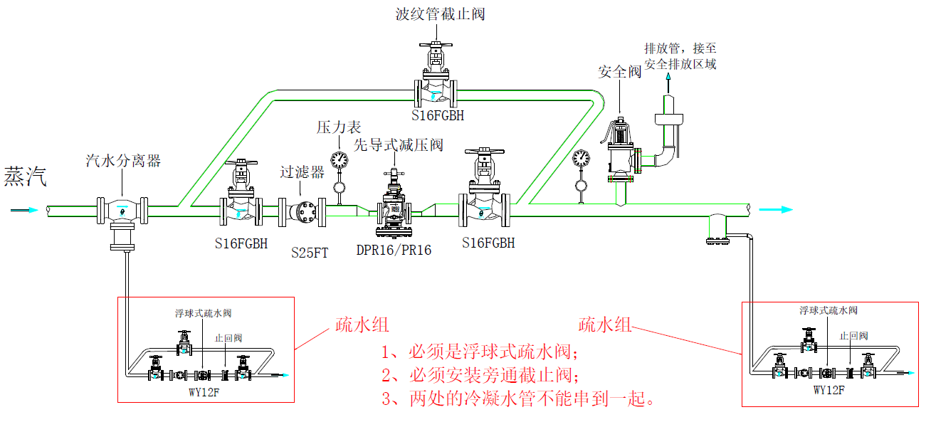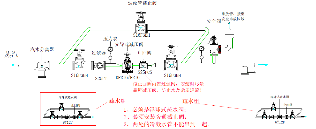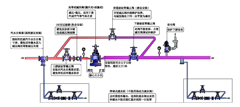 3、若未能安裝汽水分離器,則至少需要安裝一個疏水閥組,而且此疏水閥不能使用熱動力疏水閥,必須是機械式疏水閥(如浮球疏水閥),并且疏水閥必須安裝旁通,開機前疏水閥旁通需開啟直至冷凝水排盡為止,若無旁通則疏水時間至少15分鐘以上,確保冷凝水已排除干凈后再打開減壓閥前截止閥。
