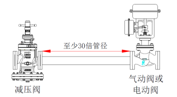 6、當減壓閥的出口(后端)裝有控制閥(開關(guān)或比例控制)時,設置管道長至少為30D 的直管段(D是管道的直徑),建議至少1米以上。