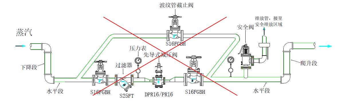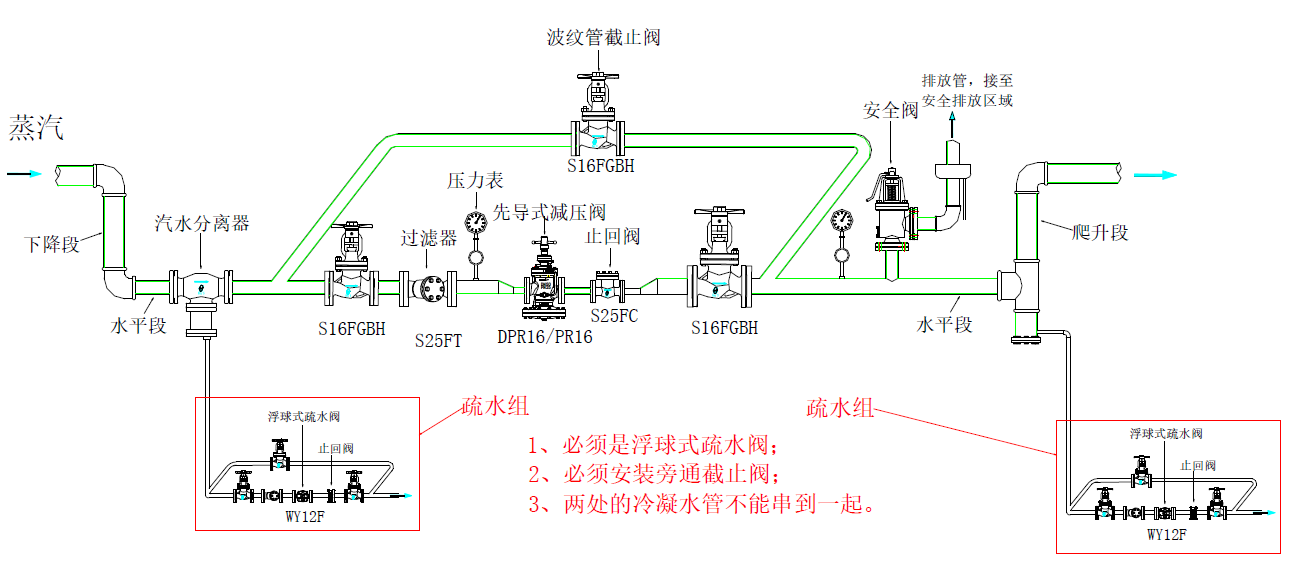 4、減壓閥后疏水組的冷凝水管,因為壓力不同,不能跟減壓閥前高壓的冷凝水管串到一起,否則冷凝水會逆流進減壓閥。若有逆流工況需安裝止回閥防護。