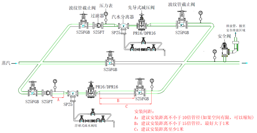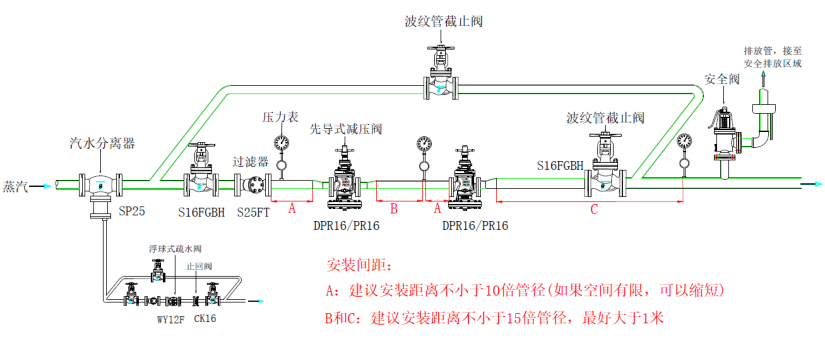 1、 對于連續(xù)生產(chǎn)的工況,減壓閥前3米內(nèi)建議安裝汽水分離器(如下圖所示),否則,前端管路冷凝水會直接進入到減壓閥內(nèi),會對減壓閥內(nèi)部的彈簧、主閥閥桿、活塞或膜片等關(guān)鍵零部件造成致命傷害,進而導致減壓閥失效或損壞。