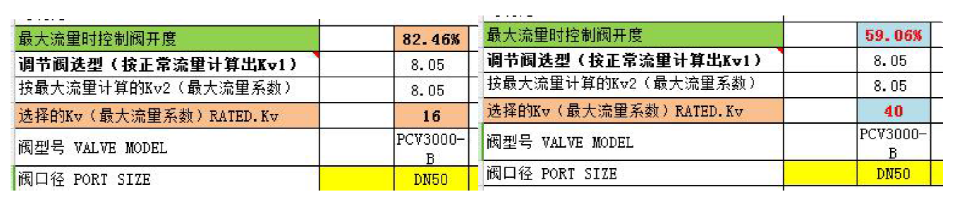 因為管徑是DN50的,一般用戶都希望盡量不要改管,從上面控制閥選型表中查出,DN50的Kv有16和40兩種,